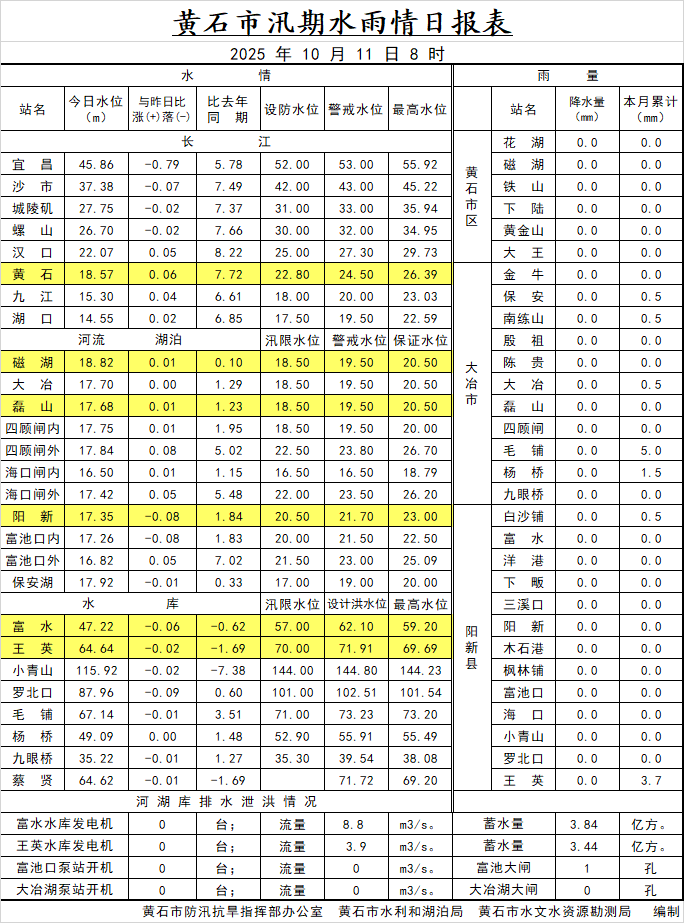 2025年10月11日水雨情日报表